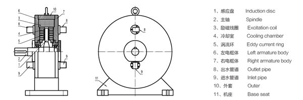 當(dāng)激磁線圈通上直流電時(shí),其產(chǎn)生的磁通經(jīng)左右電樞體、渦流環(huán)、感應(yīng)盤,形成閉合磁路,有與轉(zhuǎn)子形狀猶如直齒輪,當(dāng)感應(yīng)盤被原動(dòng)機(jī)帶動(dòng)旋轉(zhuǎn)時(shí),渦流環(huán)內(nèi)表面產(chǎn)生疏密相間的磁場(chǎng),該磁場(chǎng)在渦流環(huán)的表面上任一點(diǎn)呈交變變化,因此在渦流環(huán)內(nèi)表面及一定深度范圍內(nèi)產(chǎn)生渦流,由于渦流形成的磁場(chǎng)與原磁場(chǎng)的相互作用,在感應(yīng)盤上就產(chǎn)生了制動(dòng)力矩。