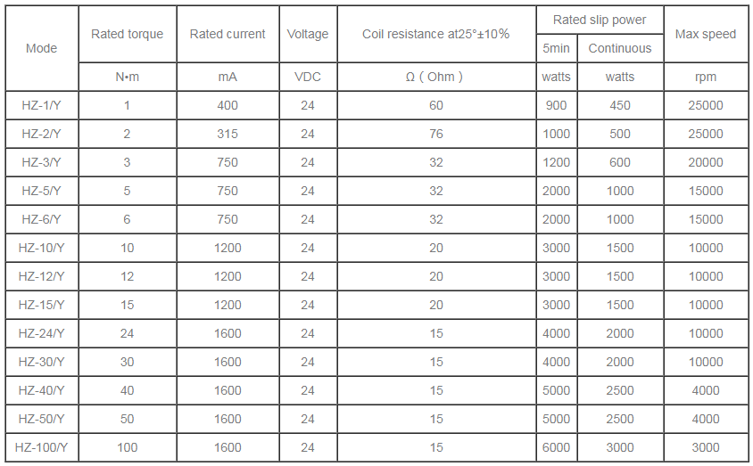 Excitation current is basically linear with the output torque,which can be controlled within 5-100% of the rated value.Large ou Calculation method In the case of winding processing,tension control is often required. The actual tension on the wire and strip at this time is determined by the following formula. F=M÷R F─tension N(Newton) R─material roll radius m(m) M─torqueN•m(N•m) During the operation of hysteresis brake, the power consumed is converted into heat . If the rated slip power is exceeded , the device will be damaged by overheating. Slip power P=M×n÷9.55=F×v